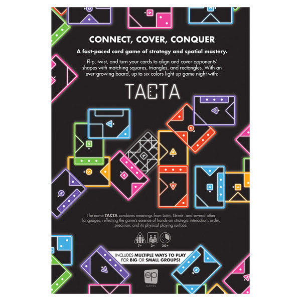 It’s all connected! In this sneakily strategic card game, players flip, twist, and turn their cards to align and cover their opponents’ shapes with matching squares, triangles, and rectangles. With an ever-growing board, up to 8 colors light up game night with TACTA. Analyze, strategize, and optimize because in TACTA, every card counts.