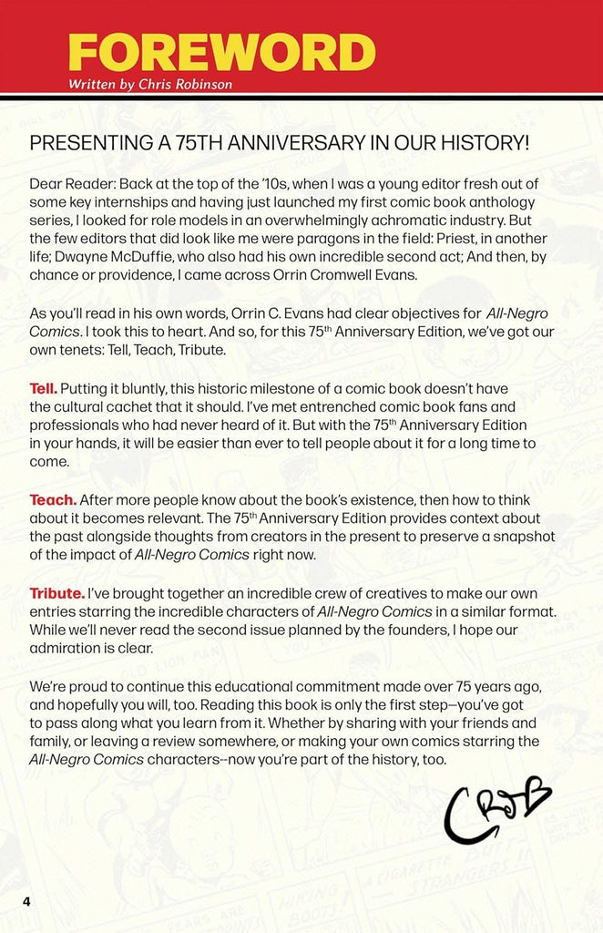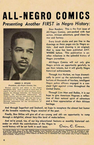 Three quarters of a century ago, Orrin C. Evans lead a team of cartoonists to create the first comic book anthology of original Black characters created by Black talent, with the expressed purpose of entertaining while rejecting harmful stereotypes and pushing boundaries in the industry. This was only 8 years after Action Comics #1, 6 years after Captain America #1 and a whole 19 years before Black Panther hit the pages of Fantastic Four.