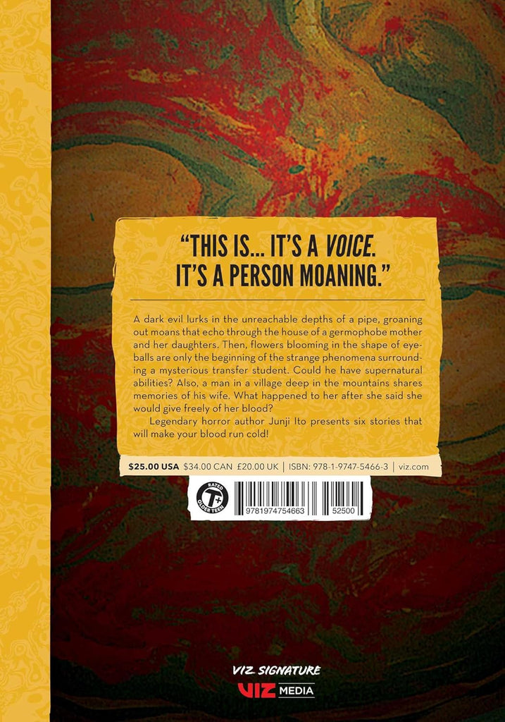 A dark evil lurks in the unreachable depths of a pipe, groaning out moans that echo through the house of a germophobe mother and her daughters. In another tale, flowers blooming in the shape of eyeballs are only the beginning of the strange phenomena surrounding a mysterious transfer student. Could he have supernatural abilities? Also, a man in a village deep in the mountains shares memories of his wife. What happened to her after she said she would give freely of her blood?