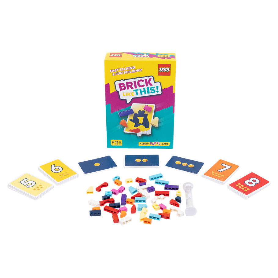 In Brick Like This! Teams of two, one Instructor and one Builder, are tasked with building a shape out of LEGO bricks. The Instructor will tell the Builder how to build a shape on a Shape Card that only the Instructor can see. All teams play at the same time, racing to build their shapes the fastest. The winner is the team with the most points at the end of six rounds!
