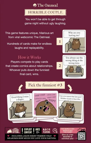 Horrible Couple is an unfiltered couples card game about love, laughs, and terrible decisions. Created by The Oatmeal and Exploding Kittens, it turns romance into ridiculous three-panel comics where the best (or worst) punchline wins. You can play cooperatively to test your connections or competitively to see who comes up with the funniest ending.