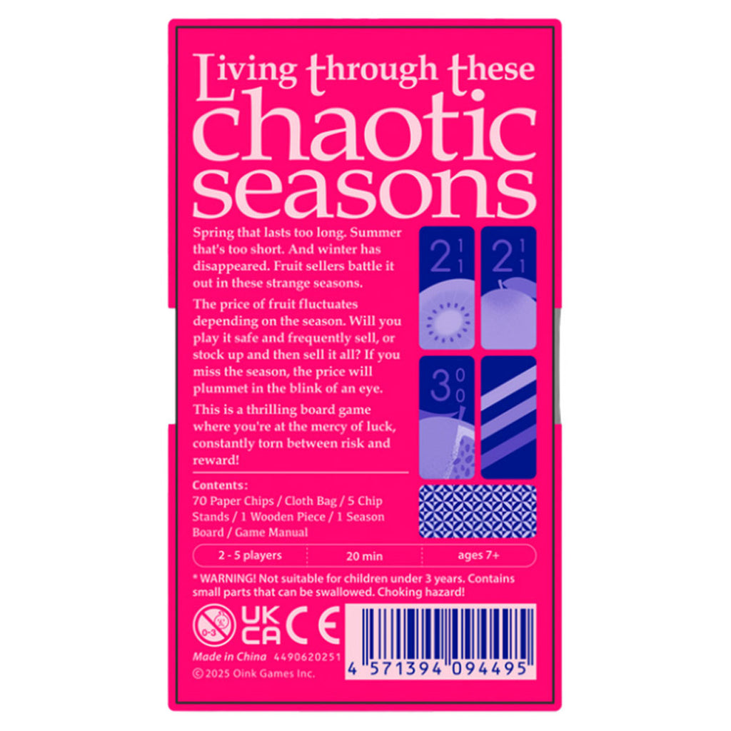 Win Before Winter Returns: The game races towards a finish as players attempt to outmaneuver each other before the season deck cycles twice. Quick thinking and bold moves are rewarded in this thrilling race to become the most prosperous fruit trader before the seasons run out.